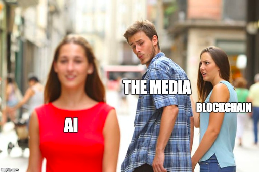 You may have seen the Distracted Boyfriend meme on social feeds last year. It epitomizes how media has pivoted from blockchain and crypto-currency stories to the new kid in town, artificial intelligence.